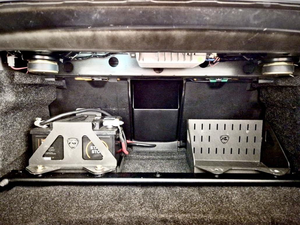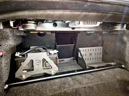 The RRP rear strut brace & battery relocation kit combines two product into one, firstly the rear strut brace which mounts on the floor of the boot to provide additional rigidity to the rear suspension towers and secondly a complete bolt in battery relocation kit.